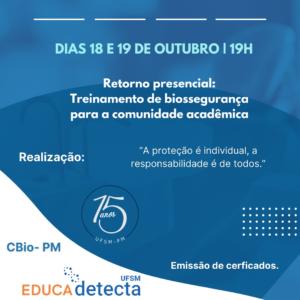 18 e 19/10 – 19h – Treinamento Retorno presencial: Treinamento de biossegurança para a comunidade acadêmica. Transmissão: Youtube UFSM-Detecta