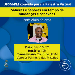 09/11 – 19h – Palestra Saberes e Sabores em tempo de mudanças e conexões, ministrada pelo professor Alain Kalema. Transmissão: canal do Youtube UFSM campus Palmeira das Missões.
