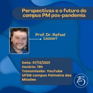 07/12 – 19h – Perspectivas e o futuro do campus PM pós-pandemia, com o palestrante prof. Dr. Rafael Lazzari. O evento, aberto à comunidade acadêmica e geral, será transmitido pelo canal do YouTube UFSM Campus Palmeira das Missões.