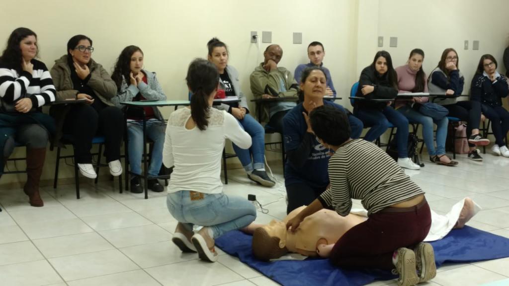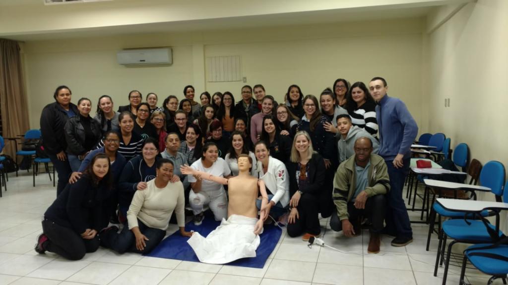 Na noite do dia 23 de maio de 2019, alunos do terceiro semestre do Curso Técnico em Cuidados de Idosos ministraram uma oficina sobre Primeiros Socorros aos alunos do primeiro semestre do Curso Técnico em Secretariado. A oficina de Primeiros Socorros é tradicionalmente ofertada aos alunos do Secretariado durante as aulas da disciplina de Técnicas Secretariais, ministrada pela professora Cândida Martins Pinto. Até então, sempre um profissional externo da área da saúde era convidado. Desta vez, com o intuito de repassar os aprendizados adquiridos no curso Técnico em Cuidados de Idosos, os alunos, orientados pelas professoras Cristiane Trivisiol da Silva e Caren Jacobi, foram convidados a ministrar a oficina. De forma lúdica e prática, os palestrantes encenaram situações de risco em que havia necessidade de rápido atendimento. Após as encenações e explicações, os alunos do Secretariado foram convidados a praticarem em um boneco específico para práticas de compressão cardíaca. No final da noite, como forma de agradecimento, os alunos do Secretariado ofereceram um coquetel, que também objetivou a integração das duas turmas.