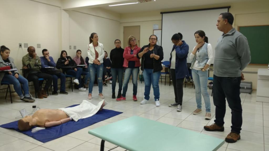 Na noite do dia 23 de maio de 2019, alunos do terceiro semestre do Curso Técnico em Cuidados de Idosos ministraram uma oficina sobre Primeiros Socorros aos alunos do primeiro semestre do Curso Técnico em Secretariado. A oficina de Primeiros Socorros é tradicionalmente ofertada aos alunos do Secretariado durante as aulas da disciplina de Técnicas Secretariais, ministrada pela professora Cândida Martins Pinto. Até então, sempre um profissional externo da área da saúde era convidado. Desta vez, com o intuito de repassar os aprendizados adquiridos no curso Técnico em Cuidados de Idosos, os alunos, orientados pelas professoras Cristiane Trivisiol da Silva e Caren Jacobi, foram convidados a ministrar a oficina. De forma lúdica e prática, os palestrantes encenaram situações de risco em que havia necessidade de rápido atendimento. Após as encenações e explicações, os alunos do Secretariado foram convidados a praticarem em um boneco específico para práticas de compressão cardíaca. No final da noite, como forma de agradecimento, os alunos do Secretariado ofereceram um coquetel, que também objetivou a integração das duas turmas.