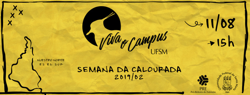 A Pró-Reitoria de Extensão da UFSM, através da Coordenadoria de Cultura e Eventos, promove no próximo domingo (11/08), o Viva o Campus Especial Calourada. O evento é aberto a toda a comunidade e ocorre das 15h às 18h. A calourada é um momento de acolhimento da Universidade aos já universitários e aos novos estudantes.