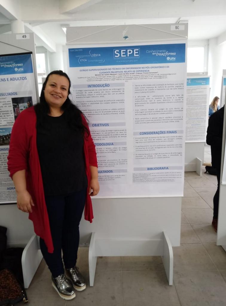 Na modalidade pôster, o intitulado “ESTÁGIO SUPERVISIONADO DO TÉCNICO EM ENFERMAGEM NO PÓS-OPERATÓRIO E OS CUIDADOS PALIATIVOS: RELATO DE EXPERIÊNCIA”.