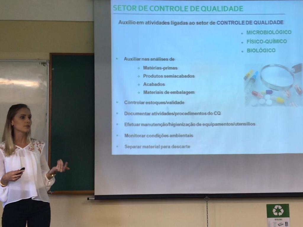 Na oportunidade, foram abordados os seguintes tópicos: mercado farmacêutico, áreas de atuação do Técnico em Farmácia na indústria (farmacêutica e cosmética), Marketing em produtos farmacêuticos, Inovação, Pesquisa e Desenvolvimento, Setor de Assuntos Regulatórios (legislação), Setor de Produção e Setor de Controle de Qualidade, bem como perfil desejado do profissional e oportunidades de emprego.