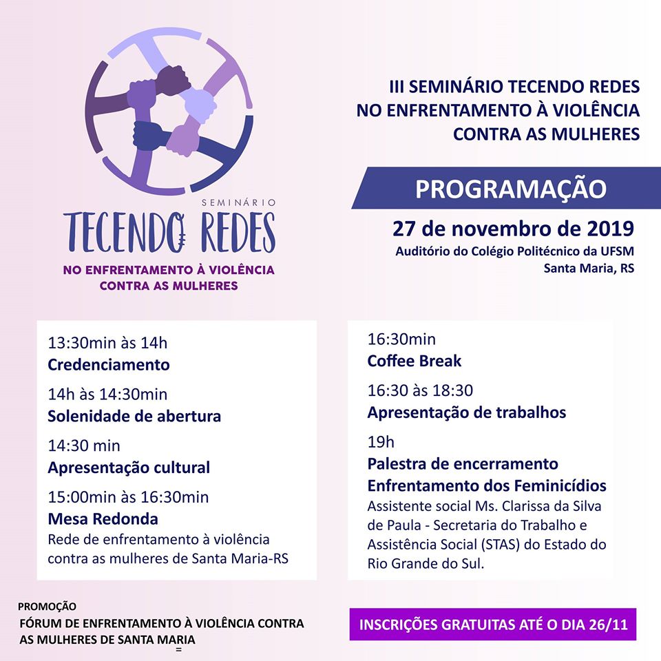 O Fórum de Enfrentamento à Violência contra Mulheres de Santa Maria liberou as lista de resumos selecionados para serem apresentados no III Seminário Tecendo Redes, que será realizado no dia 27 de novembro de 2019, no auditório do Colégio Politécnico da UFSM.