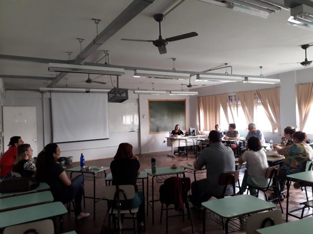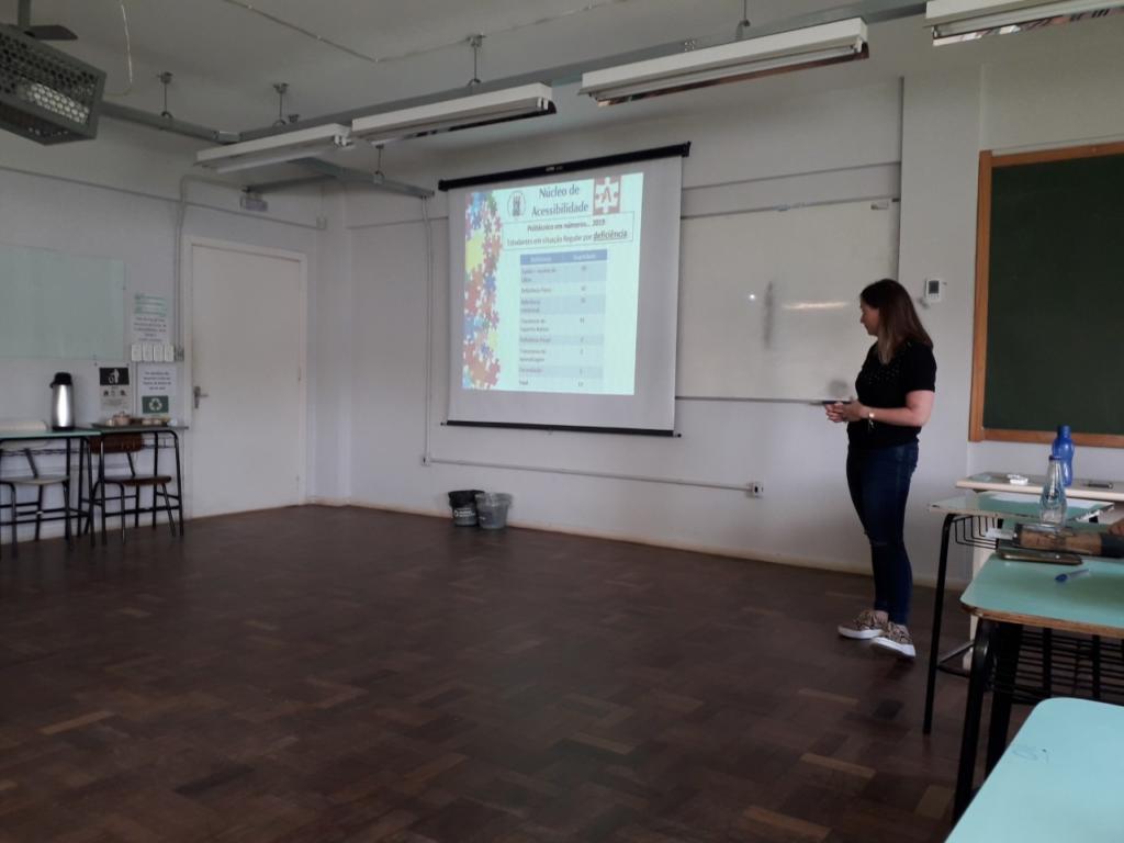 A mediação da roda foi feita pela Educadora Especial Fabiane Breitenbach, que iniciou a conversa apresentando alguns dados sobre o número de estudantes com deficiência no Colégio, bem como sobre o atendimento realizado pelo Núcleo de Acessibilidade.