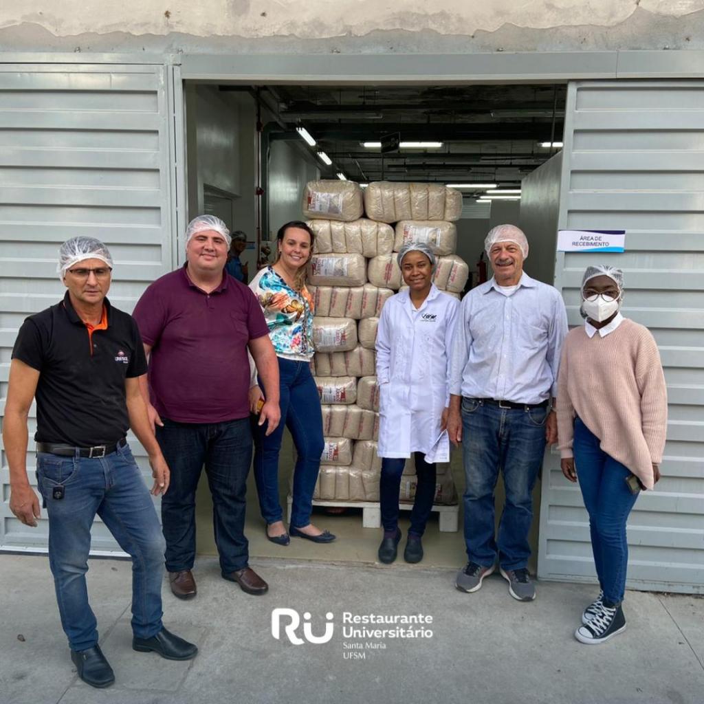 Foto: Arroz sendo entregue por representantes do projeto e colaboradores para a direção e funcionários do Restaurante Universitário. Reprodução: Assessoria de Comunicação do RU.