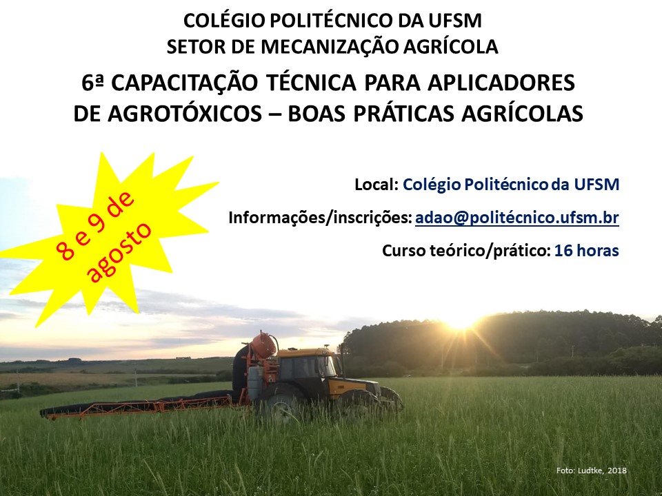 O projeto de extensão Capacitação Técnica para Aplicadores de Agrotóxicos – Boas Práticas Agrícolas irá promover a 6ª edição do Curso de Aplicador de Agrotóxicos. O evento será nos dias 8 e 9 de agosto, no Setor de Mecanização do Colégio Politécnico, e possui duração de 16 horas teórico-práticas. O objetivo é realizar a capacitação técnica de produtores e operadores de pulverizadores agrícolas, que após cinco edições já somam 127 formados. As inscrições devem ser solicitadas pelo e-mail adao@politecnico.ufsm.br, assim como demais informações sobre a capacitação.