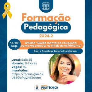 Em alusão ao “Setembro Amarelo”, mês de prevenção ao sucídio e de promoção à saúde mental, organizamos uma formação pedagógica, com a psicóloga Lidiene Marchesan, sobre Saúde Mental na Educação.