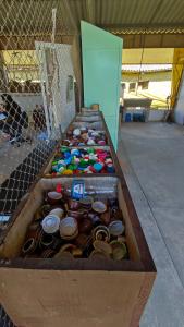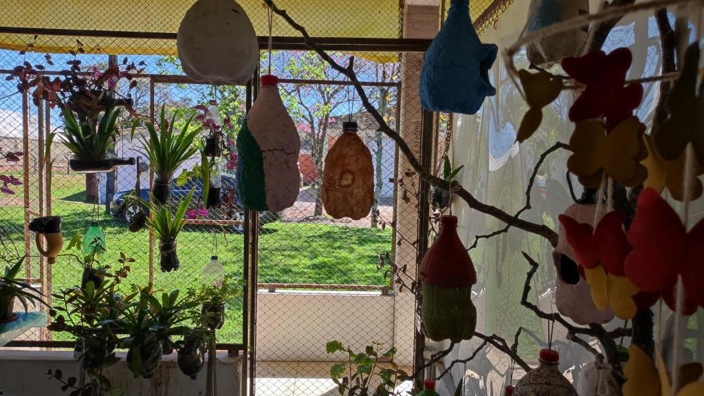 A coordenadora explica que há sempre um tema para os encontros das oficinas: “primeiro a gente vai falar do plástico, em outro nós vamos falar do papel, outro de garrafas (…) Agora no momento mesmo, nós estamos com as oficinas de recuperação de roupas e acessórios”. As roupas, entregues principalmente com a finalidade de descarte, podem ser utilizadas como enchimento para almofadas ou camas para os gatos do Colégio. Contudo, muitas delas ainda têm “potencial para serem usadas como roupas”.
