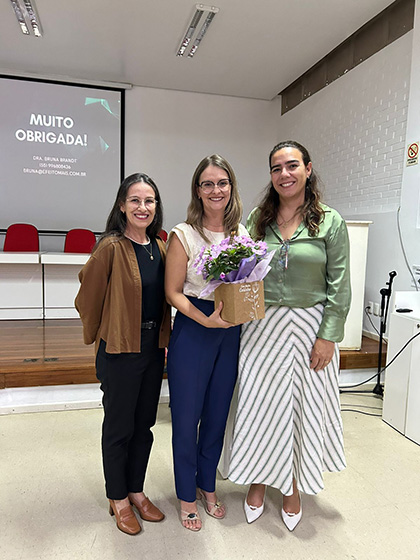 A palestrante profa. Dra. Bruna Brandt, com a diretora do Politécnico de, professora Marta Von Ende (D), e a coordenadora de ensino, professora Berenice Santini.