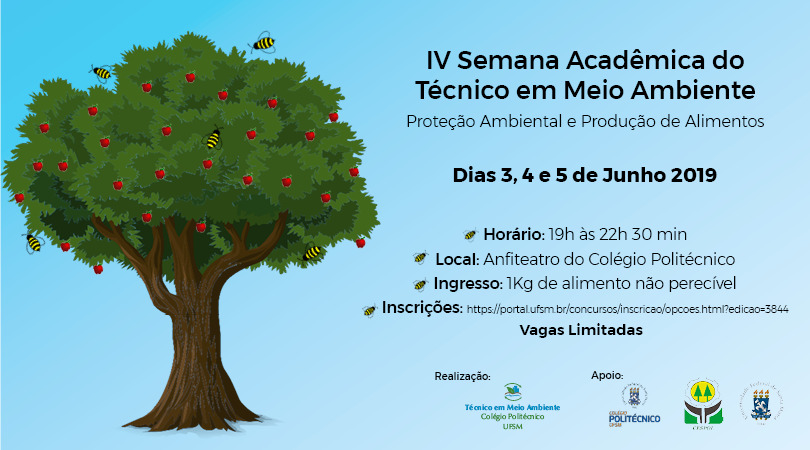 Com a temática “Proteção Ambiental e Produção de Alimentos”, o curso Técnico em Meio Ambiente do Colégio Politécnico promove, entre os dias 3 e 5 de junho, a sua IV Semana Acadêmica. O evento ocorre no Anfiteatro do Colégio Politécnico, das 19h às 22h30min.