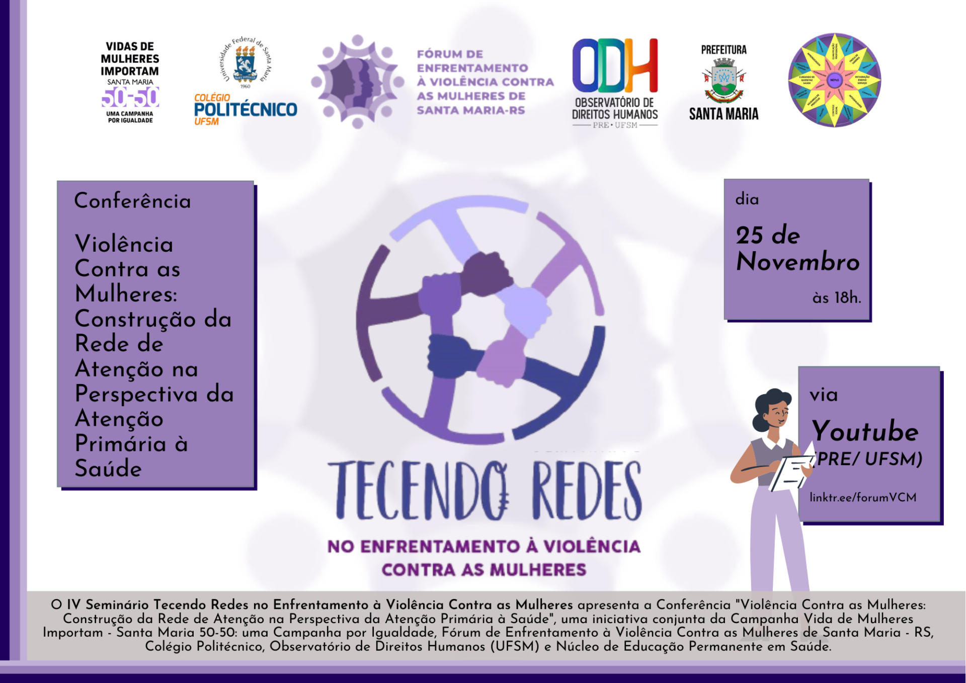 IV Seminário Tecendo Redes no Enfrentamento à Violência contra as Mulheres, a ser realizado no dia 25/11/2019 (quarta-feira), a partir das 18horas. A transmissão do evento será online pelo Youtube da Pró-Reitoria de Extensão da UFSM. O acesso, assim como as inscrições serão realizados pelo link: https://linktr.ee/forumVCM.