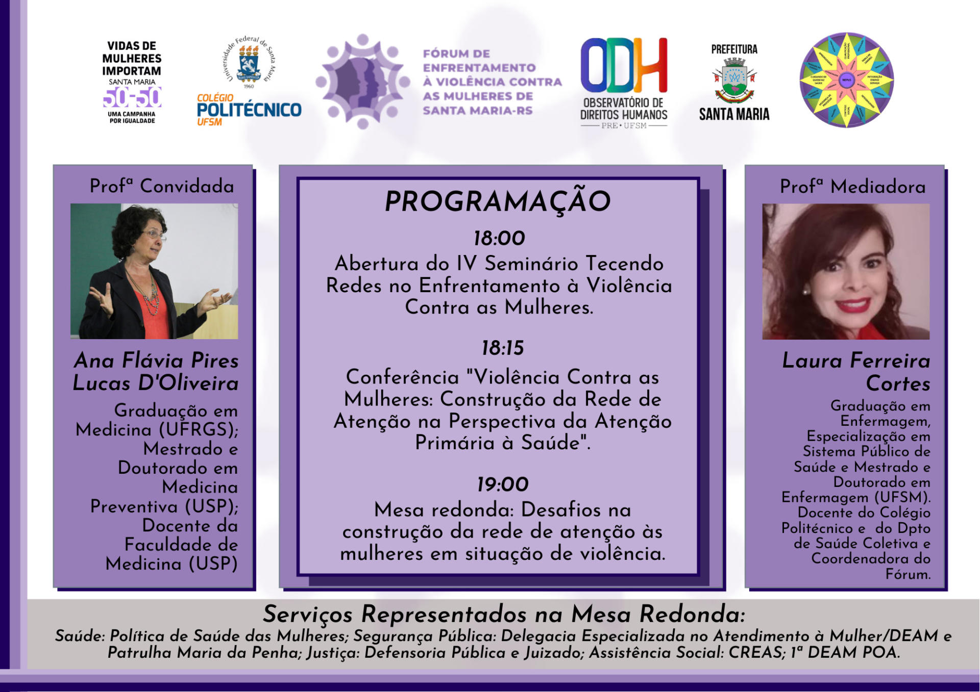 Sabendo que dia 25 de novembro é Dia Internacional de Enfrentamento à Violência contra as Mulheres, contaremos com a participação da Drª. Ana Flávia Pires Lucas D’Oliveira, graduada em Medicina (UFRGS); Doutora em Medicina Preventiva (USP); Docente da Faculdade de Medicina (USP), atuante nos temas: violência de gênero, serviços de saúde da mulher e atenção primária. Além de Mesa redonda composta por representantes dos setores de: Segurança Pública, Saúde, Assistência Social e Justiça.