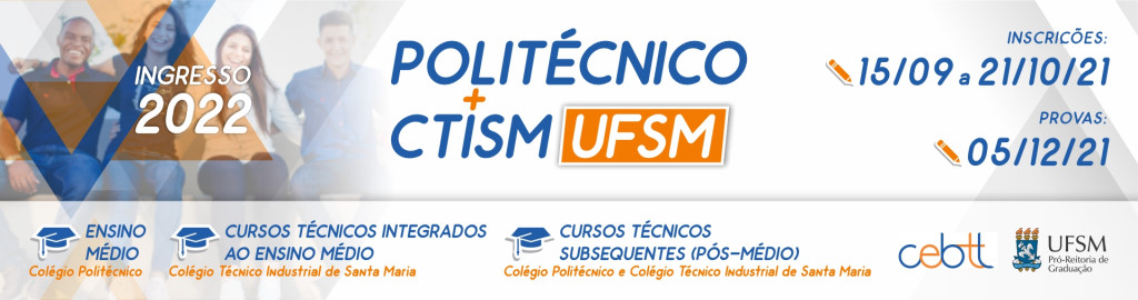 O Colégio Politécnico da Universidade Federal de Santa Maria e o Colégio Técnico Industrial de Santa Maria (CTISM) tornam público que, no período de 15 de setembro a 21 de outubro de 2021, estarão abertas as inscrições para o Processo Seletivo, visando ao ingresso em 2022 no Ensino Médio e nos Cursos Técnicos Subsequentes dos Colégios.